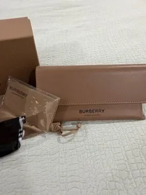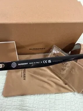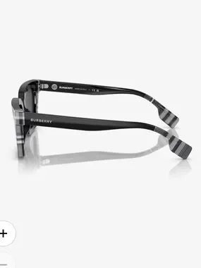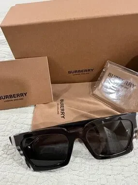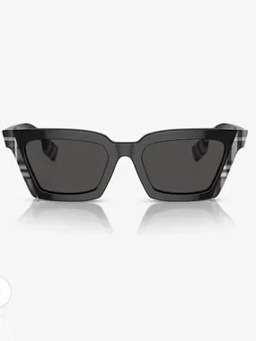 Bold square silhouette with dark lenses. Distinct Burberry plaid accents on the temples. Modern, structured look for polished outfits.