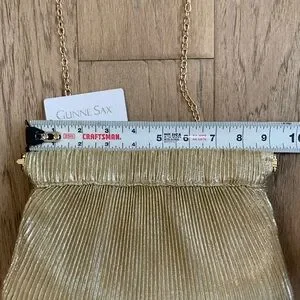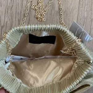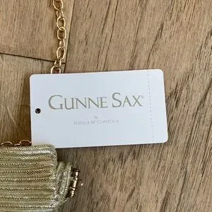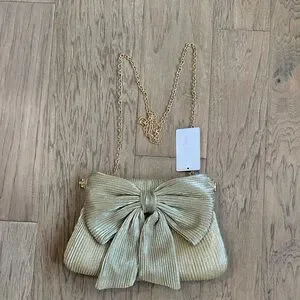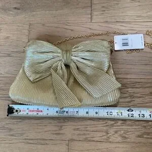 GUNNE SAX gold crossbody bag with a statement bow front. Features a chic gold chain strap and a shimmering textured finish. Perfect for evening events and special occasions.