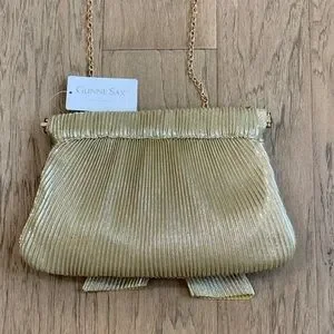 The Vivienne bow is a framed clutch closure, and offers a lot of style to accessorize with your outfit. The material is pleated metallic and offers just the right amount of shine.