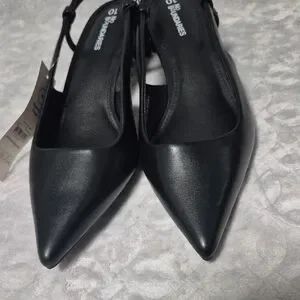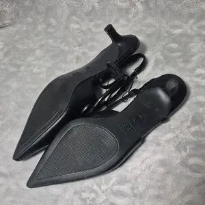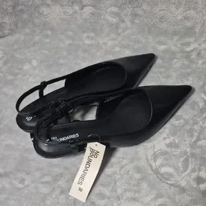 Chic black slingback with kitten heels by No Boundaries. Faux leather. Ideal for any stylish outing. Great for formal or casual with dresses or jeans.