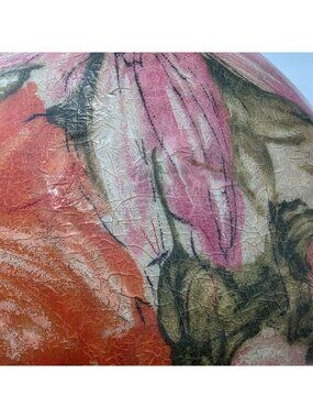 This vibrant MCM fiberglass bowl features a groovy floral design in pink and orange, perfect for adding a splash of color to your space. Ideal for retro enthusiasts and collectors alike.