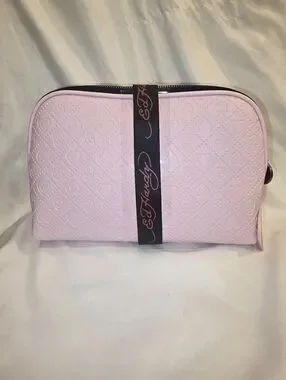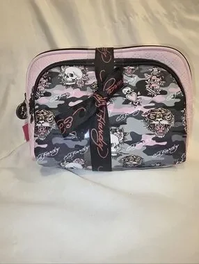 Ed Hardy cosmetic pouch with pink and black camo print. Features bold tiger and skull graphics. Zip-top closure keeps items secure. Compact and stylish for travel or daily use. This is a two-piece and new with tags