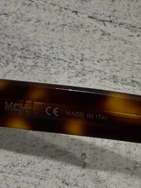 Stylish MCM sunglasses with square tortoiseshell frames. Dark green lenses offer glare reduction. Subtle metal rivet accents at temples. Bold, modern silhouette for everyday wear.