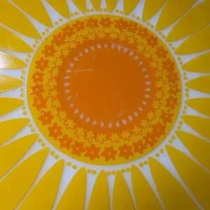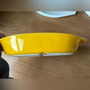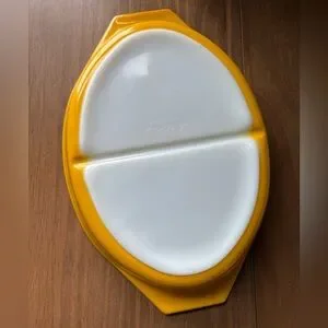 Pyrex Daisy 1 1/2 Quart Divided Dish “Golden Sunflower” 1970 designed by Cynthia Gerow 2 Scratches on middle of flower and on base as shown in pictures otherwise great condition