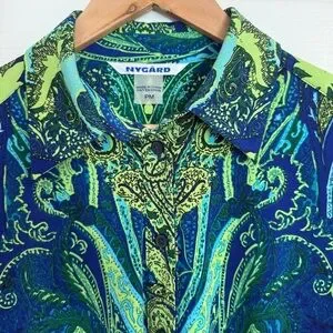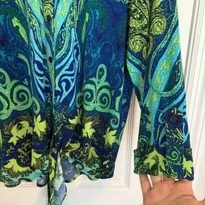 Elevate your wardrobe with this stunning green and blue paisley top. Perfect for any occasion, this top offers a vibrant and stylish look.