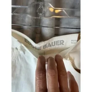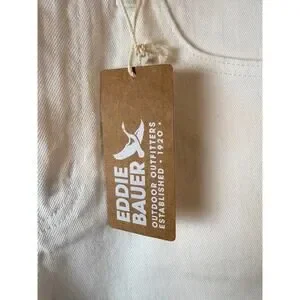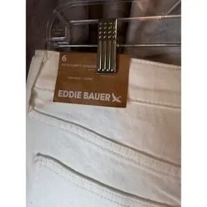 The product is a pair of women's size 6 white stretch cotton high rise cutoff denim shorts from Eddie Bauer. These Bermuda style shorts are designed for regular fit and are perfect for casual or dressy occasions. Made from comfortable stretch cotton, these shorts offer both style and comfort for any fashion-forward woman's wardrobe.