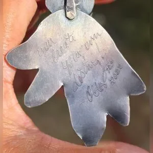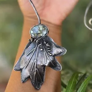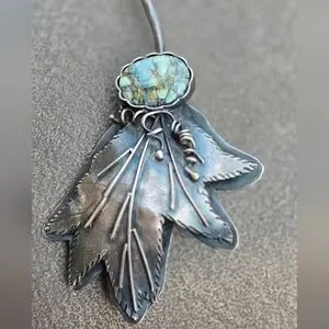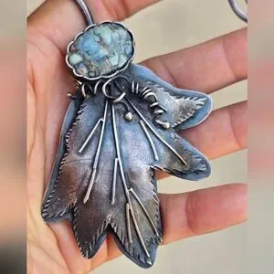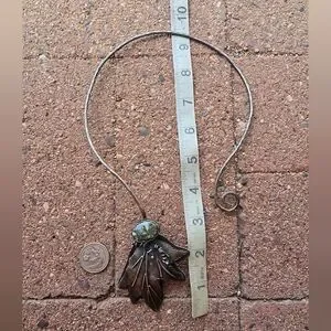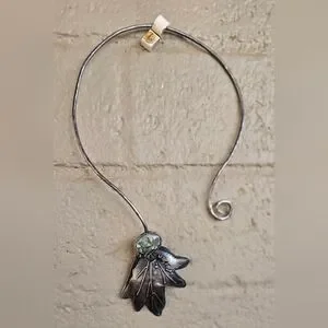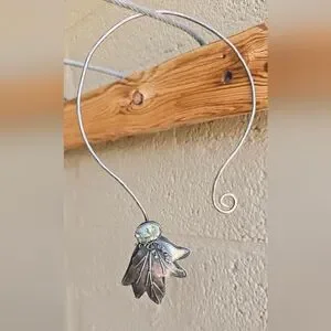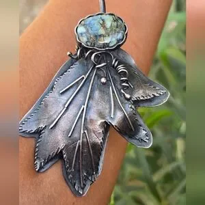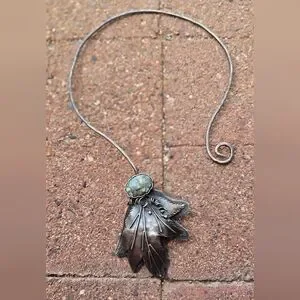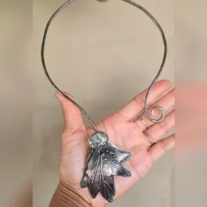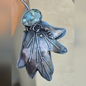 Tons of sterling silver in this exceptional artisan piece. Handmade by Cheryl of Art in Motion. Beautiful floral beauty with high-grade super special 7 dwarfs variscite. Beautiful piece of wearable art. Hammered collar with swirl at the bottom. Handsigned by Cheryl, "you create your own destiny! 925 2022." This is a peice I hoped to keep forever, but as a petite person this is just too big for me! Scrap alone is about $112 (stone doesn't weigh that much).
