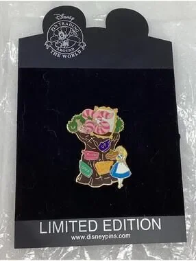 The Cheshire Cat offers Alice very little in the way of help on this maddening gold-finished character pin, one in a series celebrating the 55th Anniversary of Walt Disney's animated classic Alice in Wonderland. Enamel cloisonné. Imported. Alice is standing by a tree that has many signs on it: blue "UP", pink "YONDER", green "BACK", yellow "THAT WAY" and brown/tan "THIS WAY". The Cheshire Cat and a mirror are at the top of the tree amongst the green leaves. Pin is 1.5" by 2" Back of pin: Official Pin Trading 2006 Logo Limited Edition 250