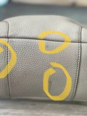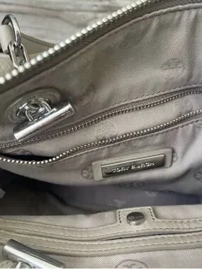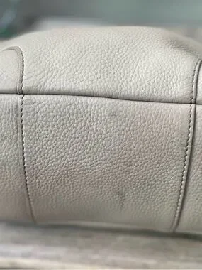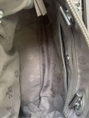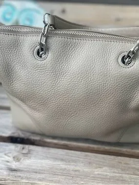 Tory Burch pebbled leather tote with signature logo medallion. Chain-link shoulder straps with leather pads. Spacious, structured interior look. Neutral light gray leather for versatile wear.
