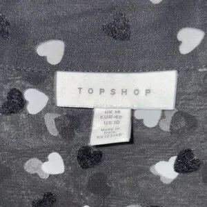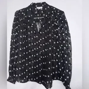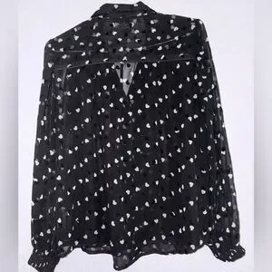 Chic black sheer blouse featuring a white pattern. Perfect for stylish layering.