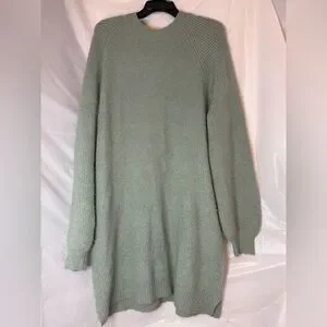 H&M crewneck sweater dress in a muted sage green. Ribbed knit texture with long sleeves. Relaxed, cozy silhouette for easy styling. Soft fabric ideal for layering. Some minor pilling, but good pre-owned condition. Size Large.
