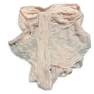 Super dreamy coquette / fairycore vibe with soft blush pink + cream tones. Features a ruched strapless bust with delicate sheer lace overlay, flowy asymmetrical hem, and romantic draped front detail. Lightweight and slightly see-through β perfect for layering or wearing with a cute bralette.