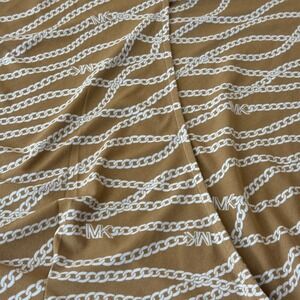 Michael Kors chain print faux-wrap top in a versatile camel tan and white colorway. This elegant blouse features a surplice V-neckline, short dolman sleeves with gold-tone button tab detailing, and a comfortable stretch jersey fabric. The all-over MK logo and chain link pattern adds a sophisticated touch to this polished silhouette, which is shown on a size small mannequin.
