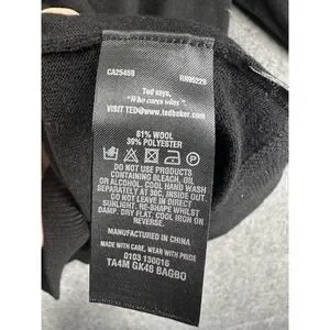 Brand details: Ted Baker London woven neck label, interior care label with fiber content and care instructions, and small woven Ted Baker side seam tab at the left hem.