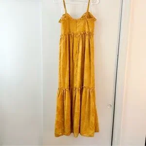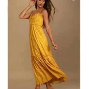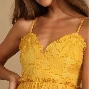 Lulus Charm & Charisma mustard yellow floral maxi dress. Gingham floral textured jacquard design. Adjustable spaghetti straps and princess seamed bodice and v-neckline. Tiered hemline. Hidden back zipper.