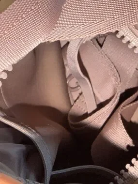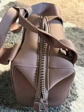 Structured cosmetic bag with dual top handles. Smooth exterior with branded logo patch. Secure zip closure for toiletries and small essentials. Neutral mauve-pink tone pairs with many styles.