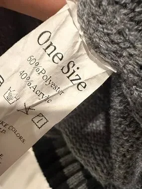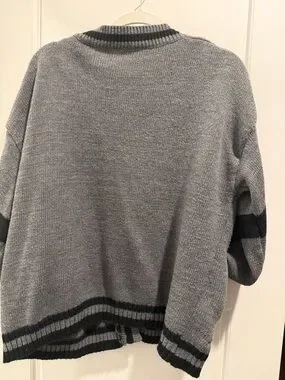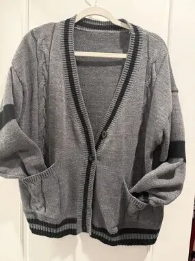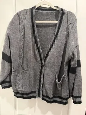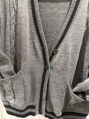 Soft gray knit cardigan with contrast black stripes and trim. Features front pockets and cable knit detailing. Button-front style for layering. Versatile neutral sweater for everyday wear. P2P 25 length 25.5