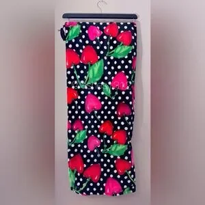Ultra soft plush throw with vibrant cherry design. Features red cherries and green leaves on a black and white polka dot background.