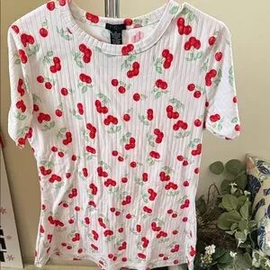 Soft ribbed knit tee featuring an allover cherry print. Short sleeves and a crew neckline. Lightweight and easy to wear for casual outfits.