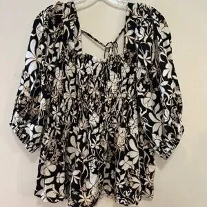 Add a bold, feminine touch to your wardrobe with this Ava & Viv™ black floral top. Features puff elbow sleeves, stretchy smocked bodice, and a flattering peplum silhouette. The square neckline and back tie detail add charm and versatility.