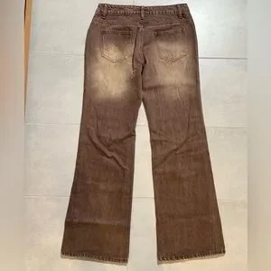 These brown jeans feature a stylish flare and wide leg design, offering a vintage-inspired look. The earthy tone and subtle texture of the denim add to their timeless appeal. Perfect for adding a touch of retro charm to your wardrobe.