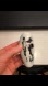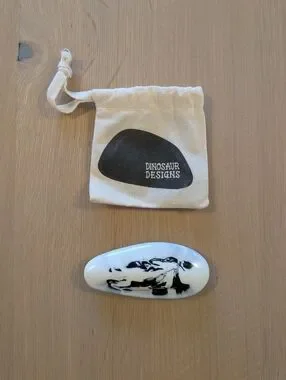 Sleek white resin pin with a striking black drawn illustration. Smooth, glossy finish. Artistic and versatile accessory. Includes small branded fabric pouch.