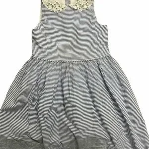 Charming blue and white striped dress featuring a delicate lace collar. Soft, breathable fabric keeps her comfortable all day. Flared skirt for easy movement and playful style. Ideal for everyday wear or special outings.