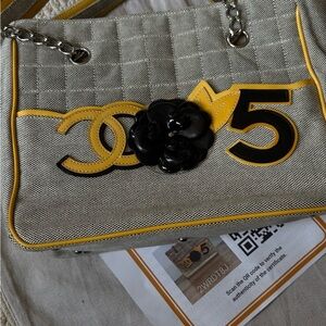 CHANEL shoulder bag in beige canvas. Yellow leather trim and applique accents. Black camellia flower detail on front. Chain shoulder straps with leather woven through. Distinctive numbered applique adds flair.