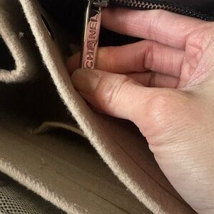 CHANEL Beige Canvas Shoulder Bag with Yellow Trim and Black Camellia