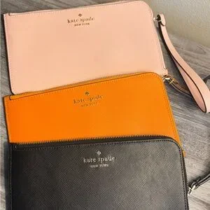 kate spade New York zip wristlet in a soft pink, vivid orange, and classic black. Crafted with textured Saffiano-style leather and gold-tone logo hardware. Slim, versatile design for cards, phone, and essentials. Includes wrist strap for easy carrying. Stylish color trio to complement any outfit. Minor scuffs on black and pink wristlet. All three for one price