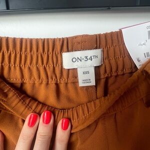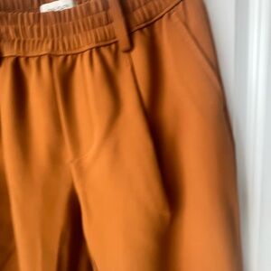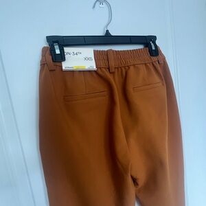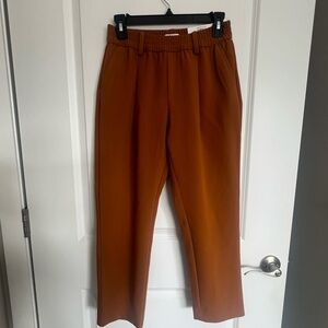 Relaxed-fit men's trousers in rust brown. Elastic waistband for all-day comfort. Clean front with side pockets for practical wear. Versatile color pairs well with casual and smart-casual looks.