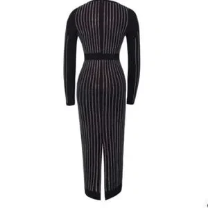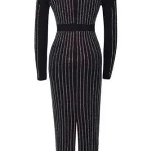 Black Ribbed Maxi Bodycon Dress with Vertical Gemstone Stripes Sz 6