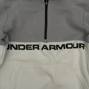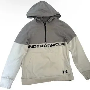 Under Armour pullover hoodie in two-tone gray and white. Front half-zip and kangaroo pocket. Bold Under Armour logo across chest and small logo at hem. Comfortable athletic style.