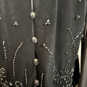 This elegant black blouse top features intricate beadwork, perfect for adding a touch of sophistication to any outfit. The sheer sleeves add a modern twist to this classic design. In very good condition. Wear with your favorite jeans or dress it up with a skirt or slacks. See photos for measurements.