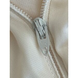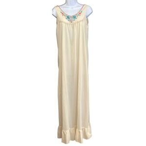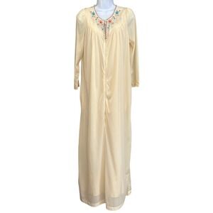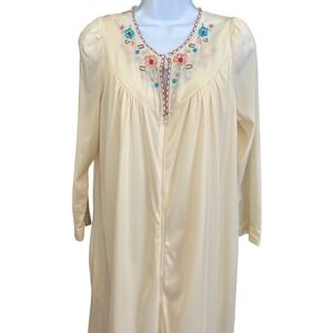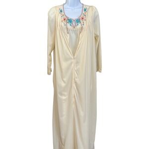 Vintage nightgown and robe set features delicate floral embroidery along the neckline with scalloped trim details. This two-piece ensemble includes a sleeveless maxi-length nightgown with a ruffled hem and a matching long-sleeve robe with a full-length front zipper. Crafted from a soft, lightweight cream fabric, both pieces showcase intricate blue and pink floral needlework that adds a touch of feminine charm to your loungewear collection.
