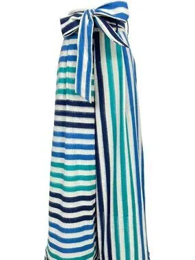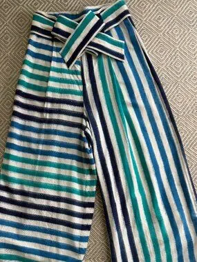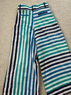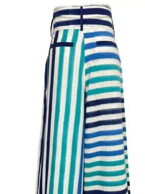 Crafted with precision from double Ikat fabric by skilled artisans in southern India, the Mykonos Trousers feature a loose, slightly A-line silhouette. They are distinguished by an asymmetric design—one side with vertical stripes and the other with horizontal stripes—in a rich gradient of blues against a white background. With a thick belt, an extra belt for versatility, and front pockets, these trousers blend sophistication with practicality. In excellent condition - worn once.