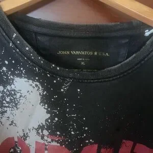 John Varvatos crewneck sweatshirt with bold red graphic. White paint-splatter accents across front. Streetwise, edgy graphic aesthetic.