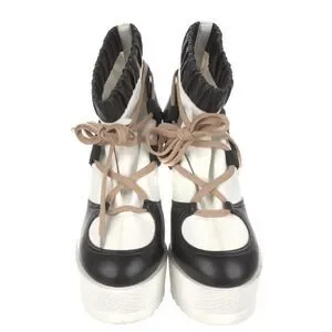 This is an authentic pair of CHANEL Calfskin Runway Wedge Short Platform Boots size 39 in Black, White and Beige. These boots are crafted in black and white leather with a lace up design and a withe wedge platform.