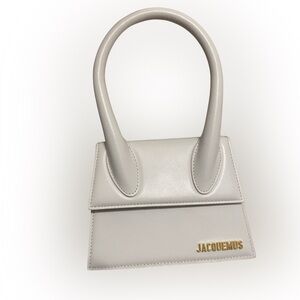 Compact Jacquemus bag in a soft white leather. Structured silhouette with curved handles. Gold-tone logo plaque on front. Sleek and modern design for everyday style.