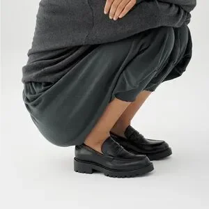 Polished black leather upper with classic penny strap. Smooth rounded toe and stitched apron. Lug sole adds subtle edge. Excellent condition - small signs of being broken in but only worn a handful of times. There are no marks or scuffs.