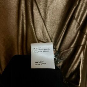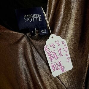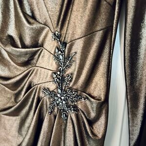 Marchesa Notte Bronze Gold Metallic Foiled Lamé Long-Sleeve Cocktail Dress
