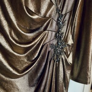 Features glamorous metallic fabric that flows like liquid gold and silver jewel embellishments.
