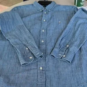 Casual button-down shirt from Ralph Lauren. Button-collar and full button front. Small embroidered logo on chest. Lightweight denim-style fabric for everyday wear.