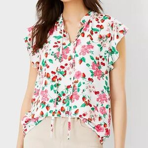 Ann Taylor strawberries, cherries, Floral Ruffle Sleeve Tie Neck Shell top