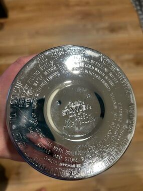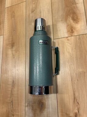 Heavy-duty insulated Stanley bottle that keeps drinks hot or cold. Features a sturdy handle for easy carrying. Includes metal cup lid and durable steel body. Simple, reliable design for everyday use.