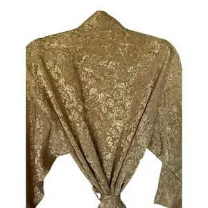 Avon Old Hollywood Regency Style vintage robe features a luxurious gold satin-like fabric with an intricate floral jacquard pattern throughout. Designed with a classic kimono-style silhouette, it includes wide three-quarter length sleeves and a matching self-tie waist belt to customize the fit. The elegant sheen and tonal rose motif provide a sophisticated look for lounging or bridal preparation. This lightweight piece offers a smooth texture and a relaxed, open-front drape.