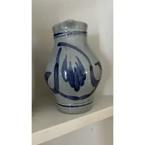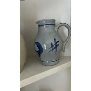 This vintage salt glaze pottery pitcher primitive farmhouse decor. Estate- selling many crocks, jugs and vintage pottery. , longaberger , etc.. . Made from clay using the pottery production technique, this pitcher has a salt glaze finish and a painted # with designs. Measuring 6.5 inches/