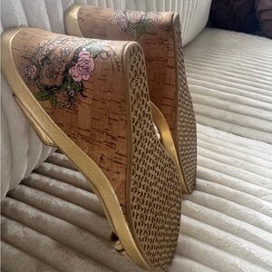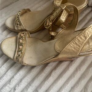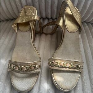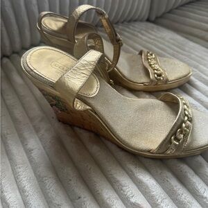 Stylish metallic gold slingback sandals from Coach. Chain trim detail across the toe. Cushioned footbed with textured fabric inlay. Adjustable slingback for a secure fit. Dressy metallic finish for versatile wear.