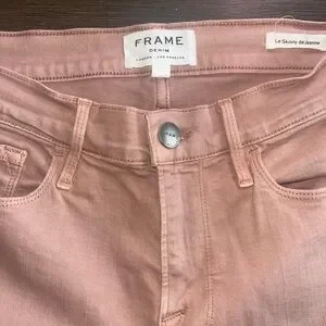 Chic and feminine FRAME Le Skinny de Jeanne jeans in a soft blush pink wash. These mid-rise skinnies feature beautiful tonal leaf embroidery along both legs and a raw frayed hem for an effortless boho-inspired touch. Crafted with FRAME’s signature premium stretch denim for a flattering, comfortable fit that moves with you.