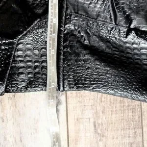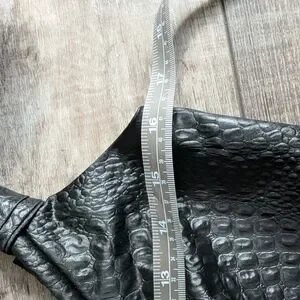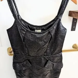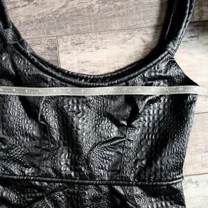 this amazing faux leather dress is perfect for a night out on the town. it's sexy and sleek. the size has been removed but the waist measures just over 14 inches and pit to put just over 16. dress is either a size 4 or a 6. see photos for the measurements